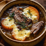 This hearty and comforting soup takes traditional French onion soup to the next level by adding fall-apart tender beef short ribs, slow-cooked in a rich, oniony broth. Topped with crispy Gruyère toasts, this dish is the perfect combination of savory, cheesy, and deeply umami flavors.