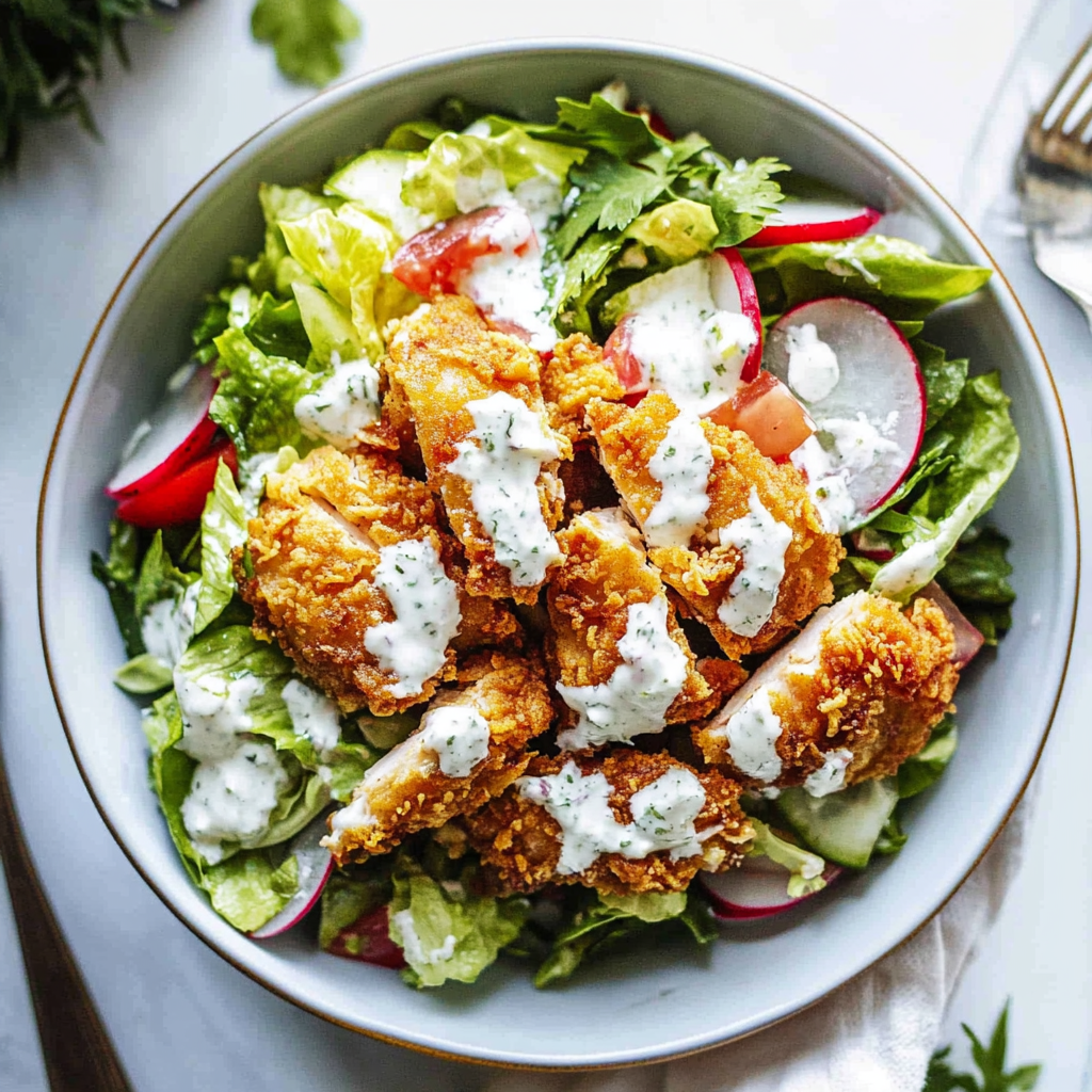Fried Chicken Salad is a satisfying and crunchy dish that combines crispy fried chicken strips with fresh greens, vegetables, cheese, and a tangy dressing for a hearty and flavorful meal.