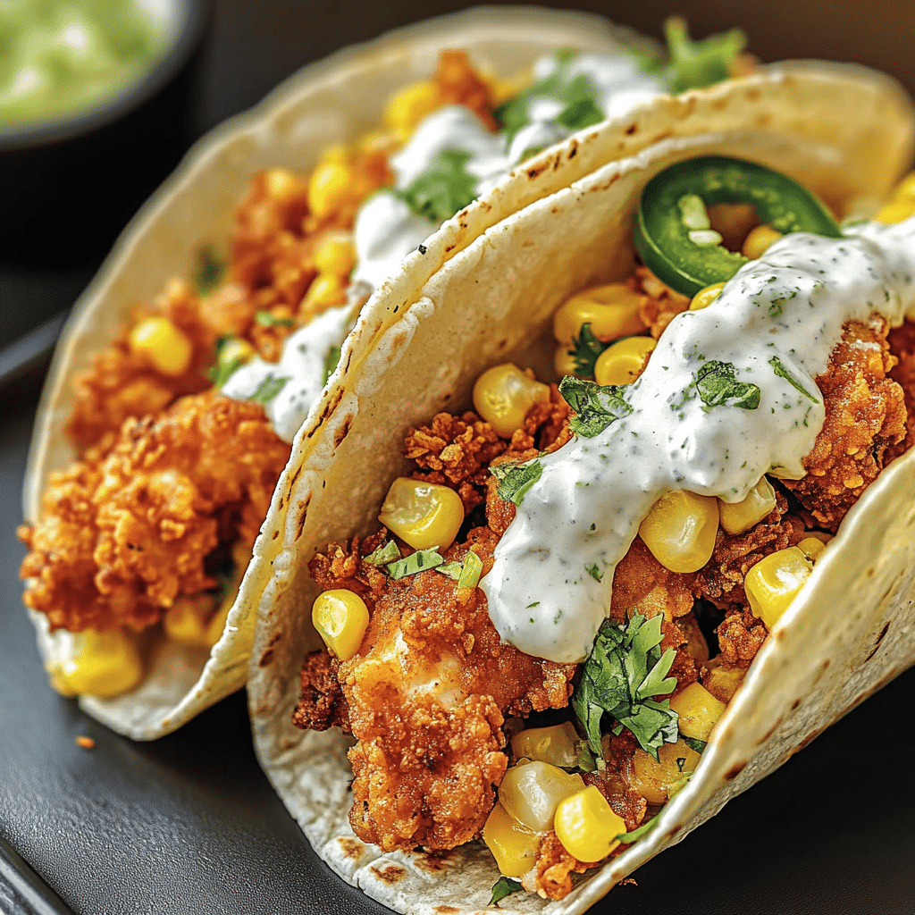 These tacos feature crispy fried chicken tenders topped with a zesty street corn salad and drizzled with a creamy jalapeño lime ranch sauce, all wrapped in warm tortillas. Perfect for taco nights or gatherings, they offer a delightful blend of Southern comfort and Mexican street food flavors.