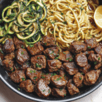 Garlic butter steak bites with lemon zucchini noodles is a quick, flavorful, and low-carb meal featuring tender, juicy steak bites cooked in a rich garlic butter sauce and served over fresh, zesty zucchini noodles. This one-pan dish is packed with protein and perfect for a healthy, satisfying dinner.