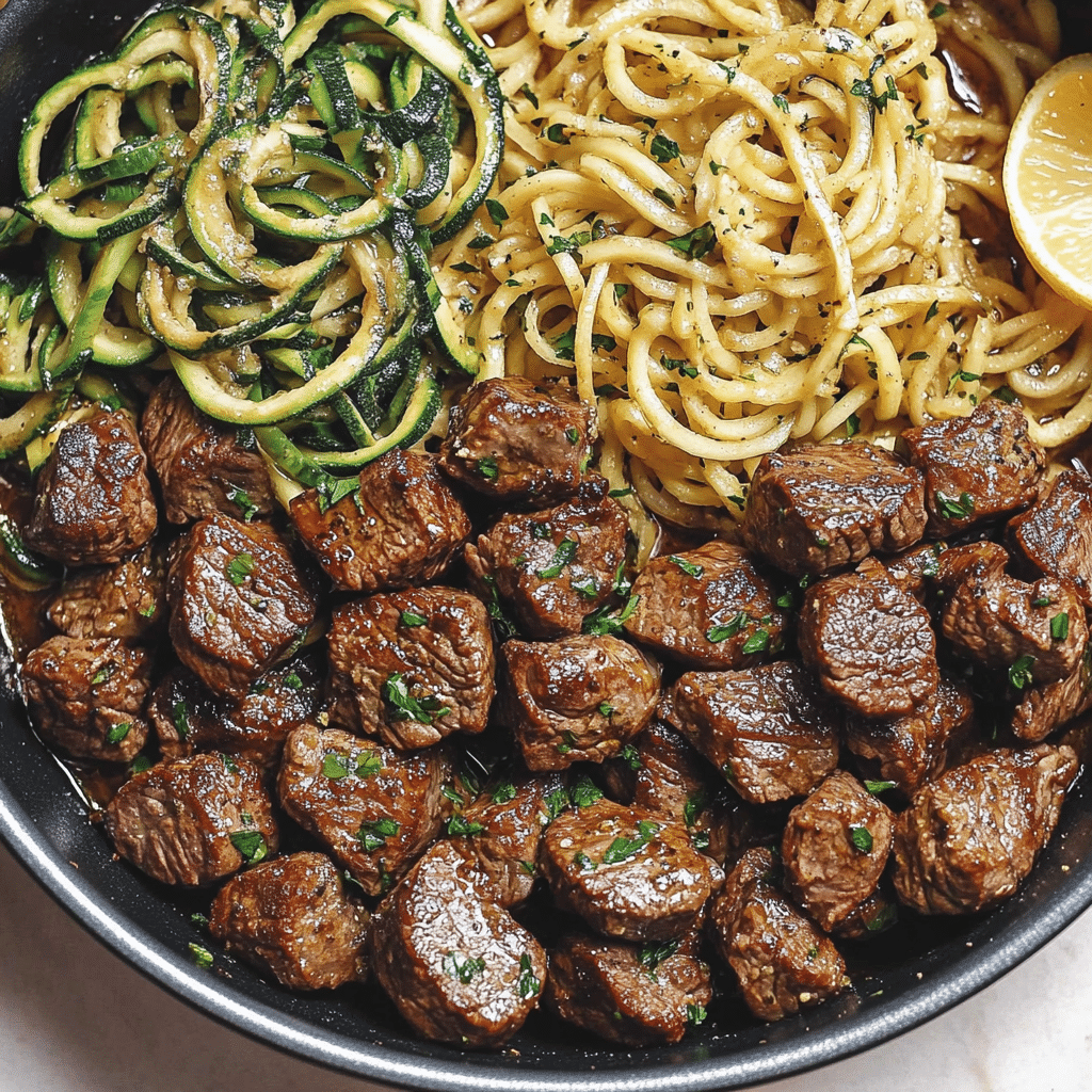 This Garlic Butter Steak Bites with Lemon Zucchini Noodles recipe is a quick, healthy, and flavorful low-carb meal. Juicy, tender steak bites are seared to perfection and tossed in a rich garlic butter sauce, then served over fresh zucchini noodles with a hint of lemon. Ready in just 20 minutes, it’s the perfect weeknight dinner!