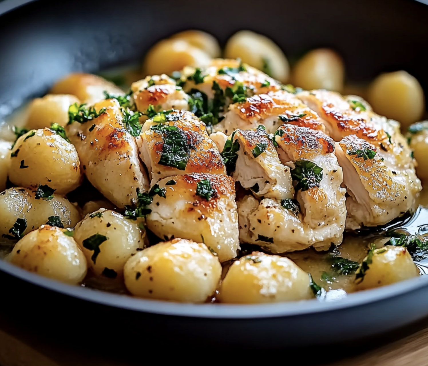 - Return the chicken to the skillet, nestling it into the creamy gnocchi.