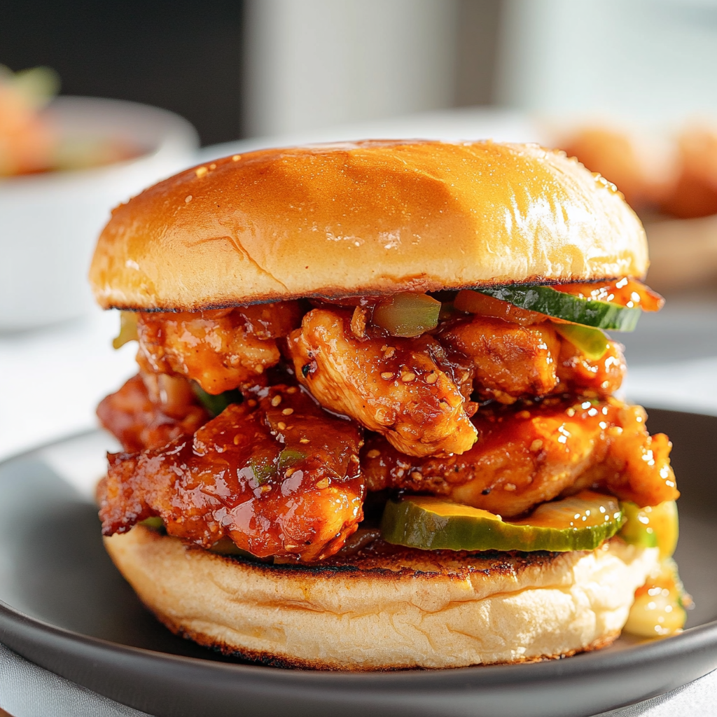 A bold and spicy Korean-inspired chicken sandwich made with juicy marinated chicken thighs in gochujang sauce, topped with a crunchy slaw and creamy mayo on a toasted bun.