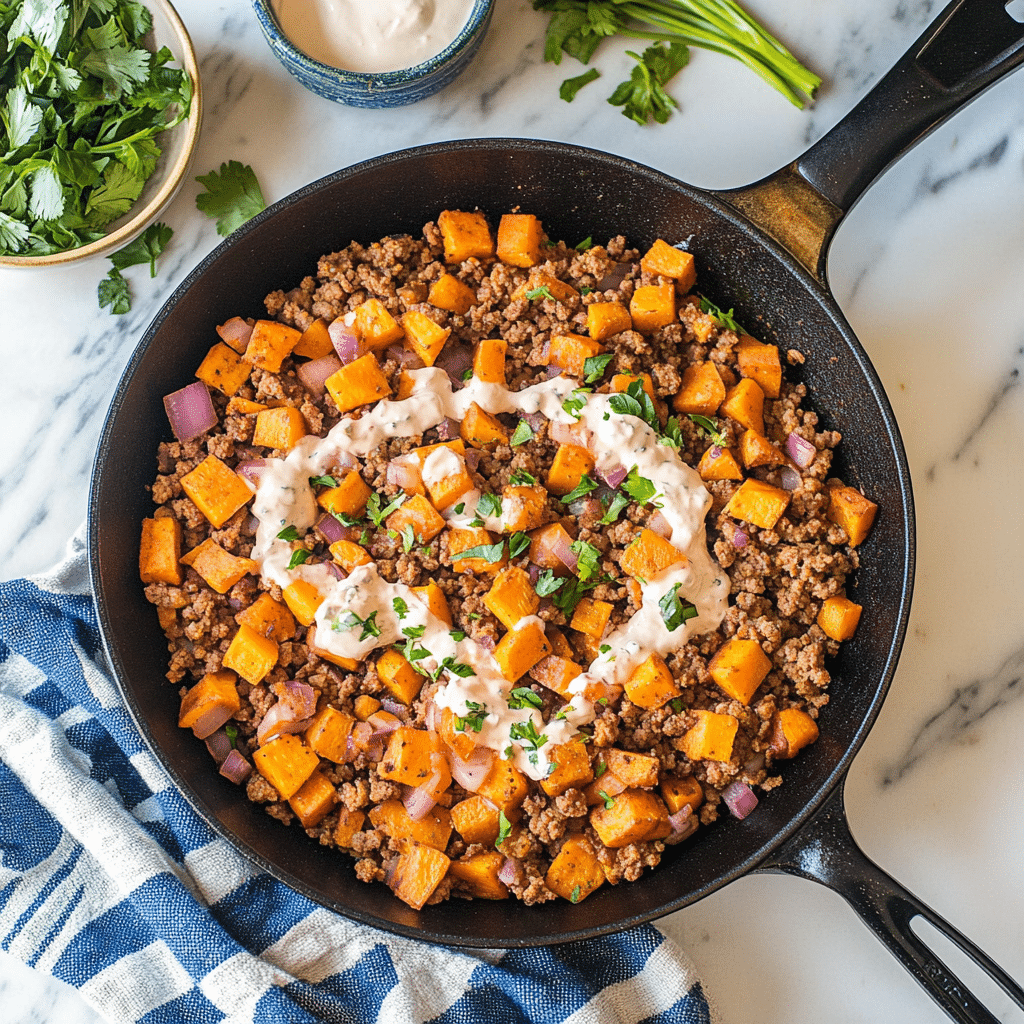 This Ground Turkey Sweet Potato Skillet is a one-pan, hearty, and nutritious meal that’s bursting with flavors. Tender sweet potatoes, seasoned ground turkey, and vibrant vegetables come together in a quick, healthy dish perfect for busy weeknights.