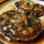 Hamburger Steaks with Onion Gravy is a classic American dish made from seasoned ground beef patties cooked until juicy and topped with a flavorful onion gravy. Unlike traditional hamburgers, these patties are cooked more like steaks, allowing them to absorb the rich flavors of the gravy. The result is a comforting, satisfying meal that pairs wonderfully with mashed potatoes, rice, or even a side of green beans.