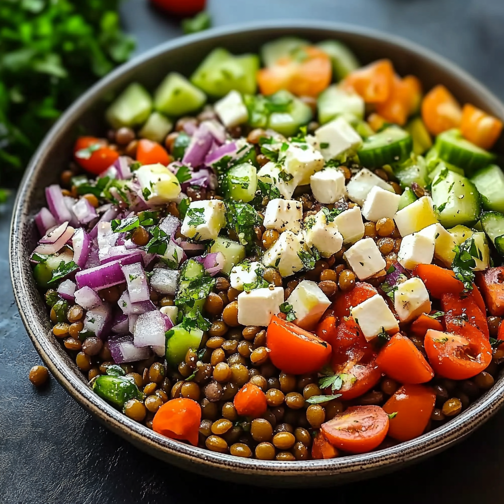 A vibrant and nutritious Mediterranean-inspired lentil salad packed with fresh vegetables, herbs, and a tangy lemon vinaigrette. Perfect as a light meal or a hearty side dish.