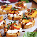 This Honey Ricotta Peach Crostini with Crispy Pancetta is the perfect blend of sweet, savory, and creamy flavors served on a crunchy baguette. Juicy, ripe peaches are layered over creamy ricotta cheese, drizzled with honey, and topped with crispy pancetta for a sophisticated appetizer or light summer snack. Perfect for brunches, garden parties, or any gathering, this easy-to-make recipe looks as good as it tastes!