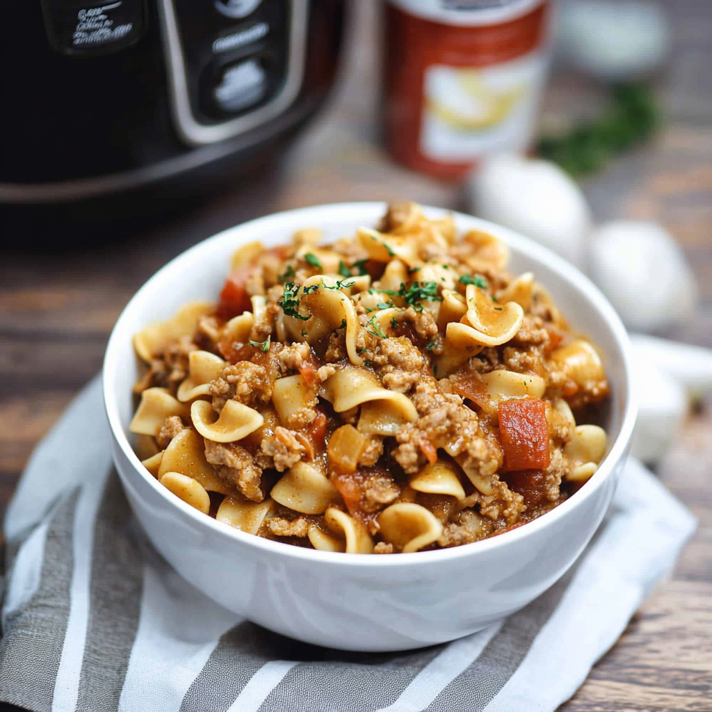 A hearty and comforting one-pot meal made in the Instant Pot, this American-style goulash features ground beef, pasta, tomatoes, and spices for an easy weeknight dinner.