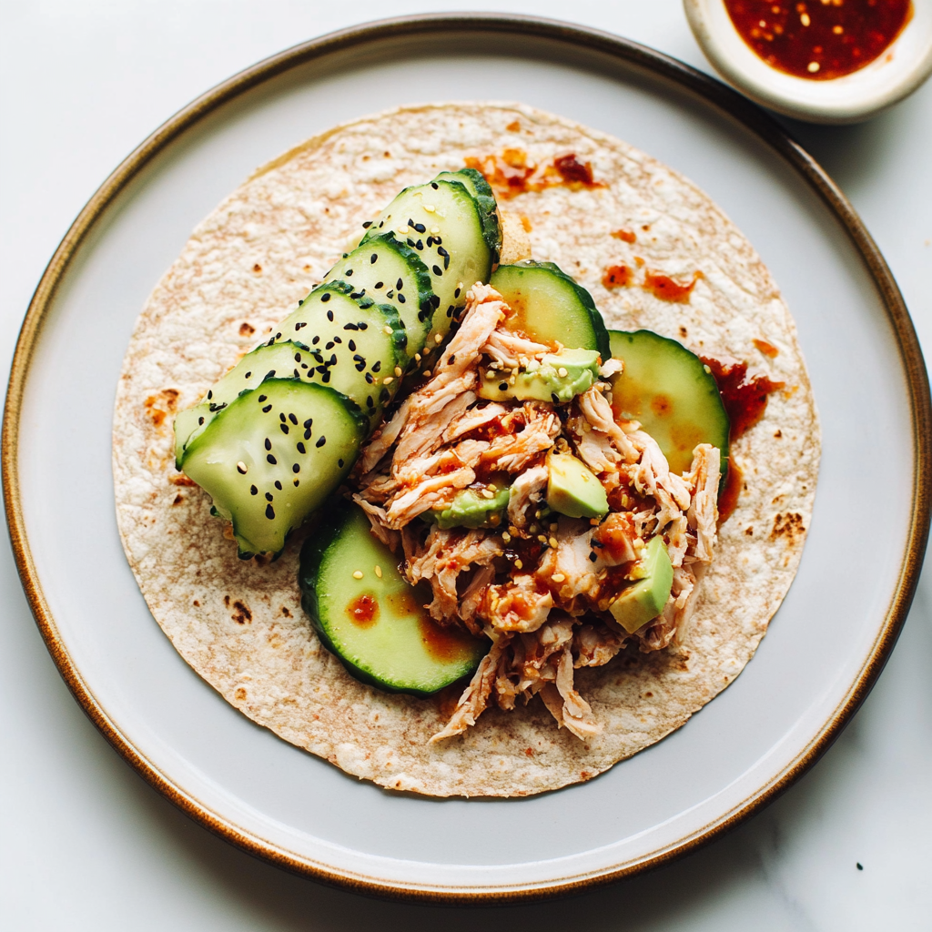 A zesty, flavorful wrap combining tuna salad with spicy, tangy kimchi and fresh vegetables for a vibrant and easy meal.