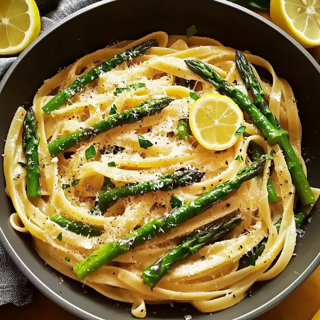 A light and zesty pasta dish featuring tender asparagus, garlic, and fresh lemon juice, perfect for a spring or summer meal.