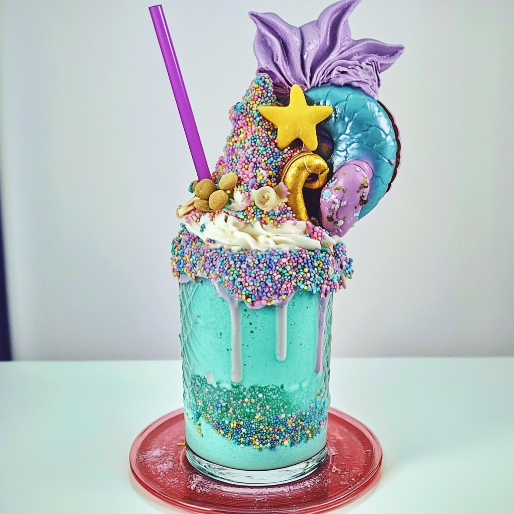 Take your dessert game under the sea with this stunning Mermaid Freakshake! Overflowing with creamy vanilla milkshake, dreamy whipped topping, candy seashells, sprinkles, and edible glitter, this over-the-top treat is a feast for the eyes and taste buds. It’s perfect for birthday parties, summer celebrations, or any time you want to wow your guests with something magical.