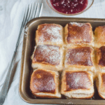 - Let cool slightly, then dust with powdered sugar. Slice into individual sliders and serve with raspberry jam if desired.