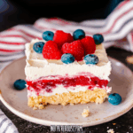 No Bake Berry Lush is a refreshing layered dessert made with a graham cracker crust, creamy cheesecake filling, berry gelatin, and fresh berries—perfect for summer gatherings and patriotic holidays.