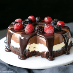 This no-bake three chocolate cake is a rich and indulgent dessert featuring layers of dark, milk, and white chocolate mousses on a biscuit base. Easy to make and perfect for any celebration, it’s a show-stopper dessert that doesn’t require an oven!