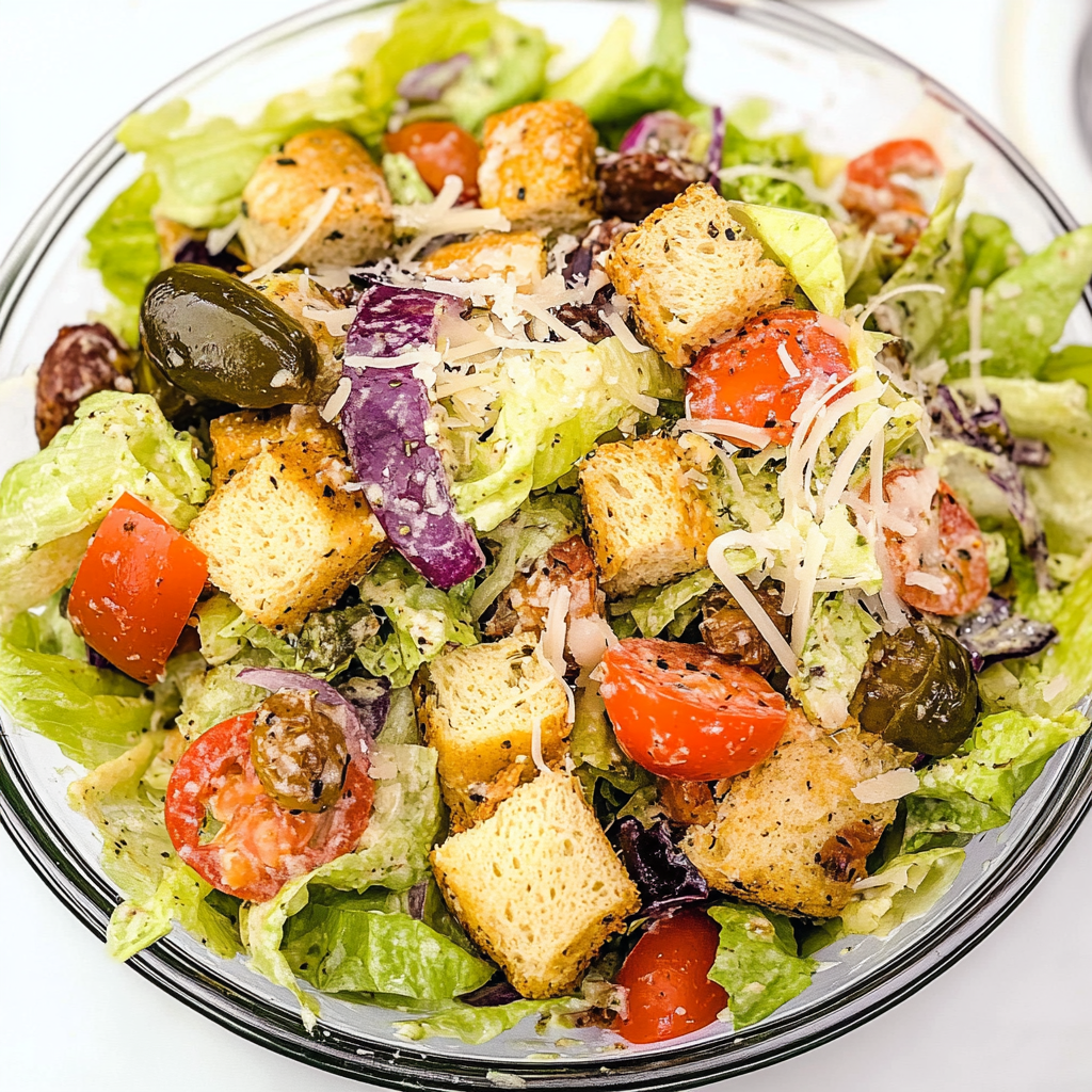 Olive Garden House Salad is a crisp, refreshing mix of iceberg lettuce, red onions, black olives, tomatoes, pepperoncini, and crunchy croutons, all tossed in the restaurant’s signature tangy Italian dressing. This famous side salad is known for its vibrant flavor and perfect balance of textures—making it a favorite accompaniment to pasta, soup, or any Italian-inspired meal.