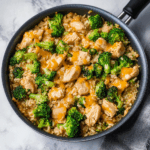 One Pan Cheesy Chicken Broccoli and Rice is a hearty and comforting meal made with tender chicken, broccoli, and rice simmered together in a single skillet and finished with melty cheese. It’s a quick and easy weeknight dinner the whole family will love.