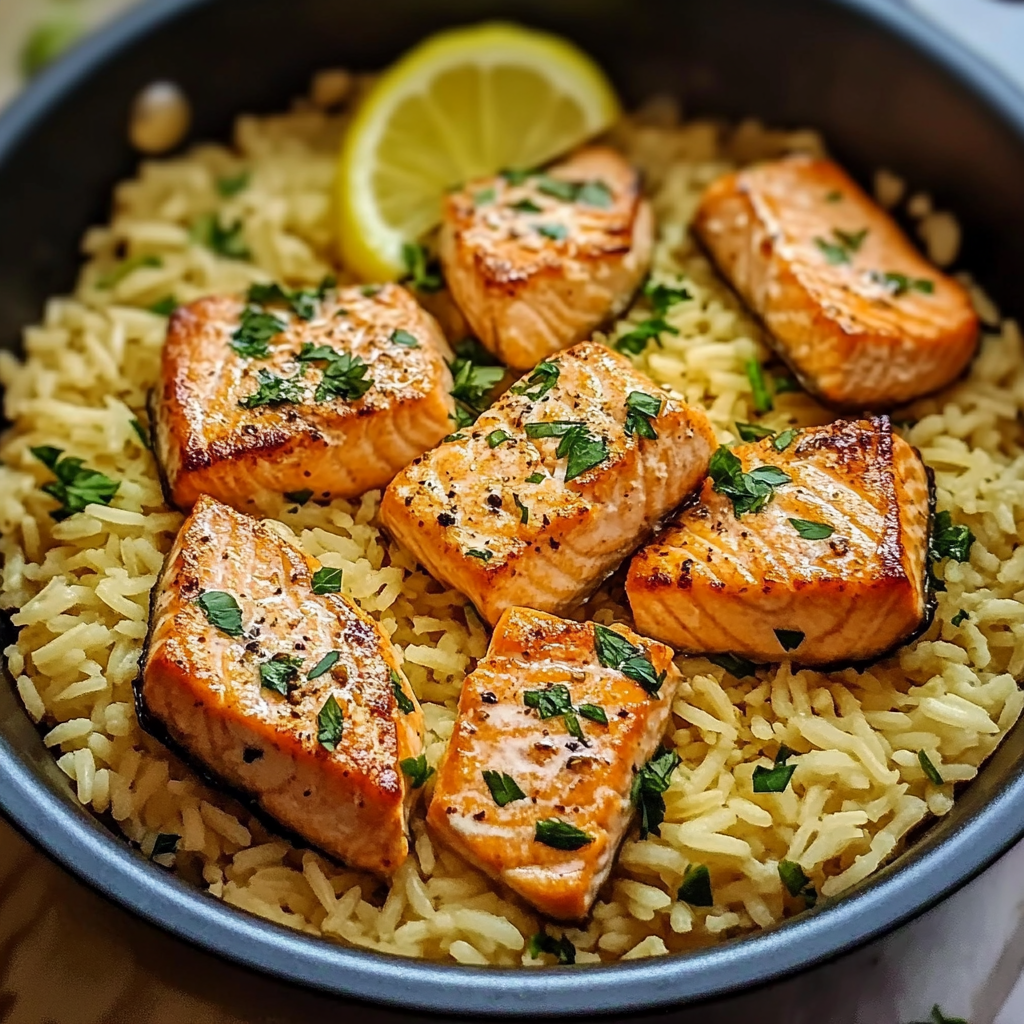 - Drizzle lemon juice over the salmon and rice, garnish with parsley, and serve warm.