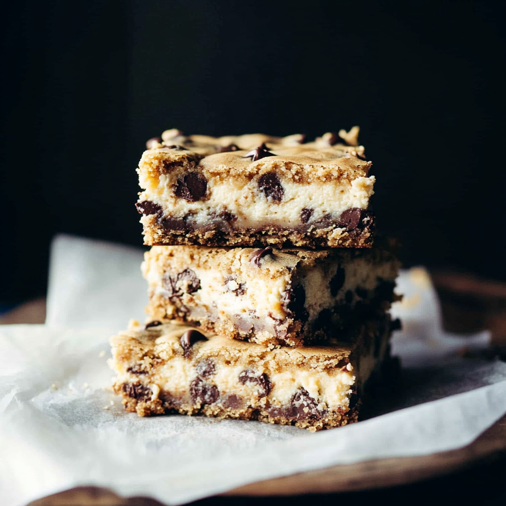 A decadent dessert that layers a buttery peanut butter chocolate chip cookie base with a creamy cheesecake filling—combining rich peanut butter, melty chocolate, and tangy cheesecake into irresistible bars.