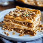 Peanut Butter Lasagna is an indulgent, no-bake layered dessert featuring a crunchy cookie crust, creamy peanut butter and cream cheese filling, rich chocolate pudding, and fluffy whipped topping. This decadent dish is a perfect treat for peanut butter lovers and makes a stunning addition to potlucks, parties, or any sweet craving.