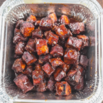 - Transfer the cubes to a disposable foil pan or foil-lined tray. Add a few cubes of butter, a drizzle of BBQ sauce, and optional brown sugar or honey. Toss to coat.