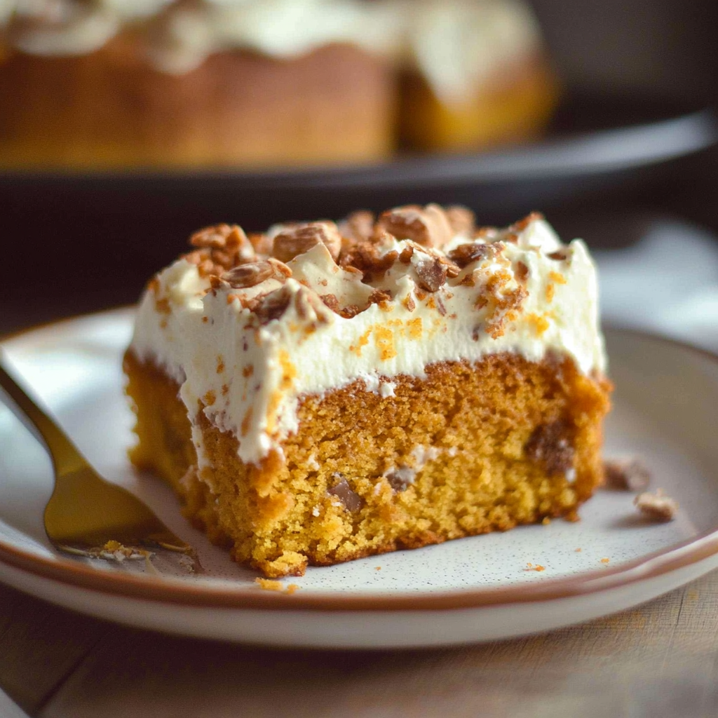 This Pumpkin Poke Cake is a moist and delicious fall dessert that combines spiced pumpkin cake with creamy vanilla pudding and a fluffy whipped topping. Every bite is filled with the warm flavors of pumpkin spice, making it perfect for Thanksgiving, holiday gatherings, or any cozy autumn occasion!