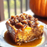 A rich and cozy dessert made with pumpkin custard-soaked bread, topped with a sweet, nutty praline sauce — perfect for fall gatherings.