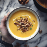 Pumpkin Soup with Walnut Crispies is a rich and comforting dish that blends creamy roasted pumpkin with aromatic herbs and a hint of garlic. Topped with sweet-and-savory walnut crispies, this soup delivers a delightful mix of textures and autumnal flavors perfect for any cozy meal.