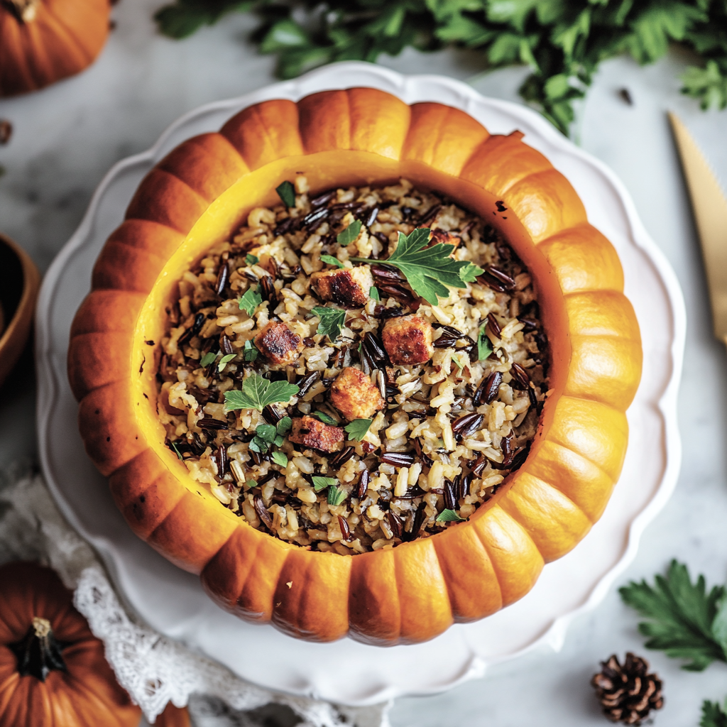 A hearty and festive dish featuring a whole pumpkin stuffed with a savory mixture of wild rice, sausage, vegetables, and herbs. Perfect for fall gatherings or as a Thanksgiving centerpiece.