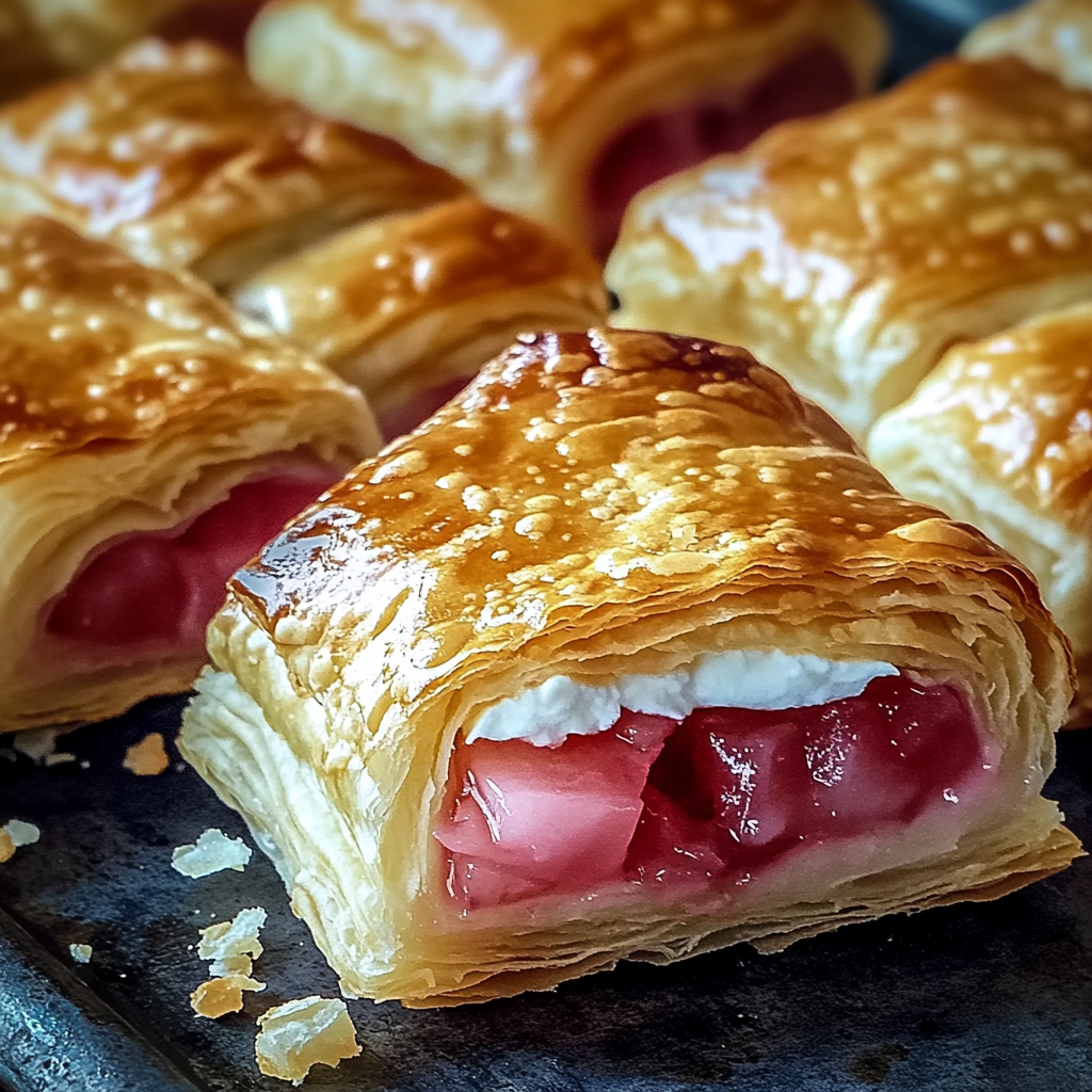 These rhubarb cream cheese puff pastries feature flaky golden pastry filled with a tangy rhubarb compote and a smooth cream cheese filling, perfect for brunch or dessert.