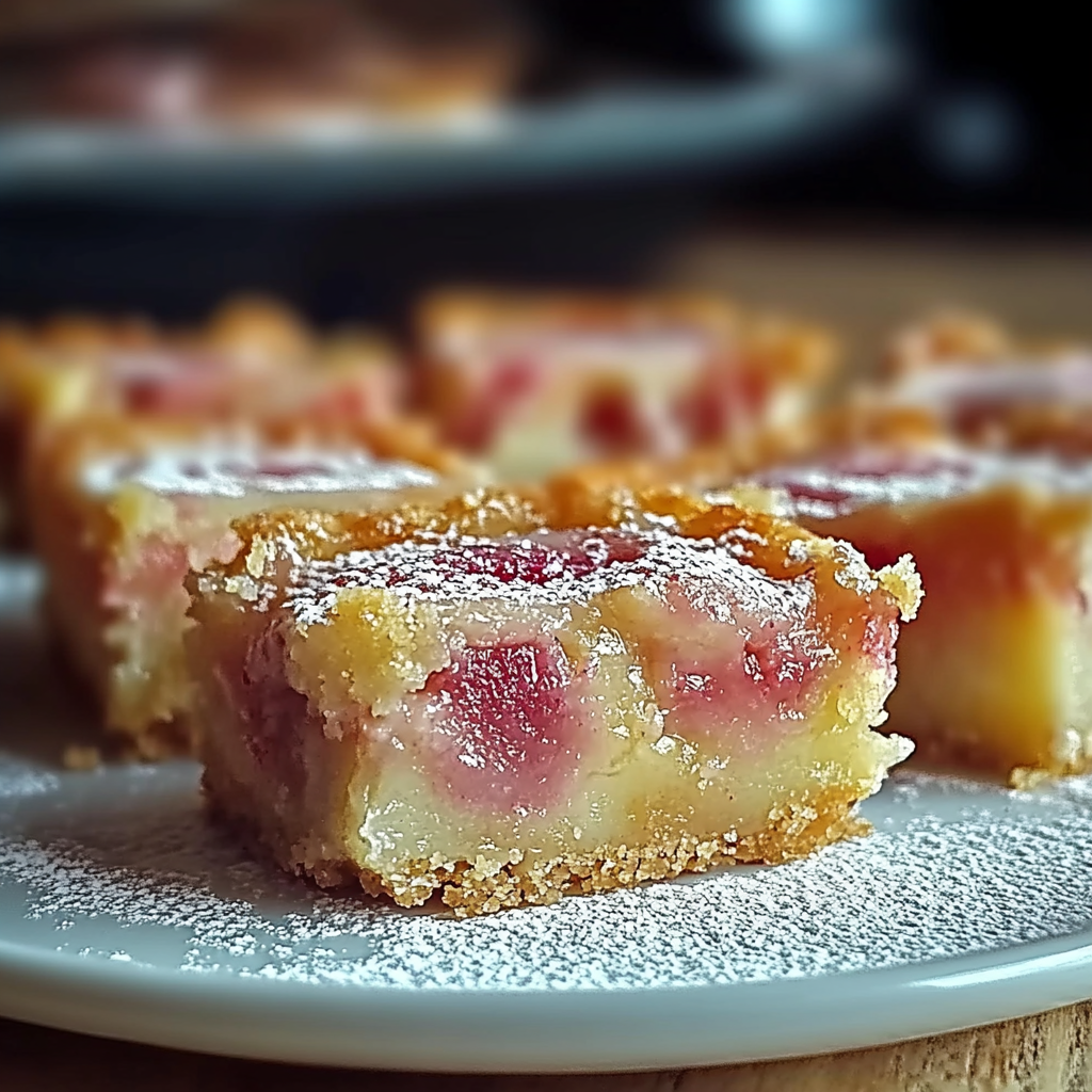 A bright and comforting dessert bar featuring a buttery oat or shortbread crust, tart rhubarb, and a creamy custard layer. These bars strike the perfect balance between tangy and sweet, making them a delightful treat any time of day.