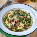 This Roasted Asparagus and Mushroom Carbonara is a fresh take on the Italian classic. Crispy bacon, roasted spring veggies, and a creamy Parmesan egg sauce come together with your favorite pasta for a comforting, flavor-packed meal. It’s rich, satisfying, and perfect for any night of the week.