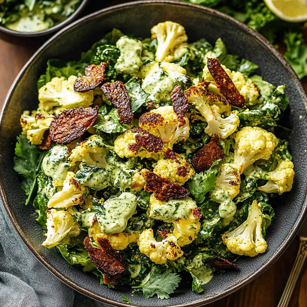 A vibrant, nutritious salad featuring roasted cauliflower and crisp greens tossed in creamy, herb-packed Green Goddess dressing—perfect as a light main or side dish.