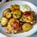 This roasted Mediterranean chicken thighs and baby potatoes recipe is a flavorful, one-pan dish that’s as simple as it is satisfying. Juicy, herb-marinated chicken thighs are roasted alongside tender baby potatoes, all infused with the bright, earthy flavors of the Mediterranean—think olive oil, garlic, lemon, oregano, and olives. It’s a wholesome and hearty meal that requires minimal prep and cleanup.