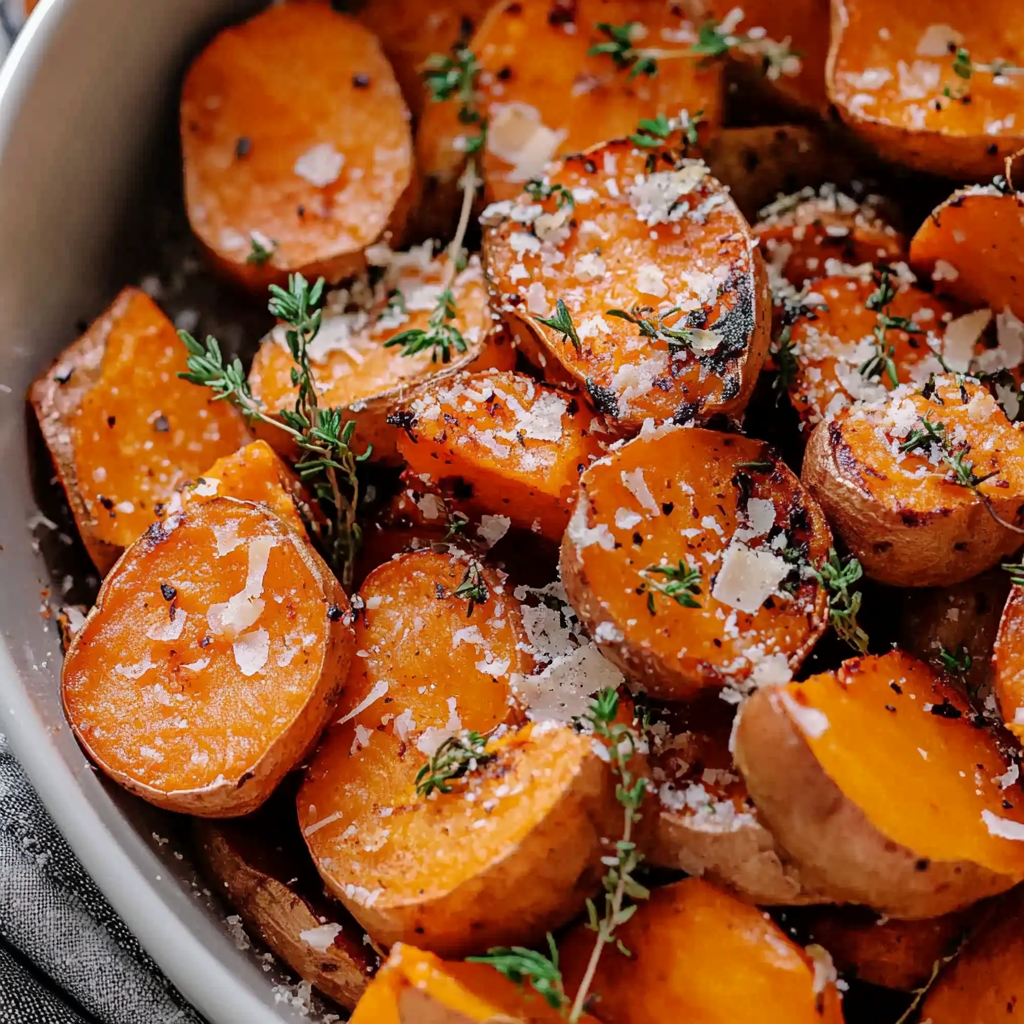 A savory side dish of roasted sweet potatoes tossed with garlic, Parmesan cheese, and herbs, roasted to crispy perfection for a flavorful and healthy complement to any meal.