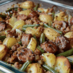 A comforting one‑dish casserole featuring hearty sausage, tender green beans, and soft potatoes in a savory sauce—perfect for a satisfying family meal.