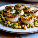 Scallops with Sautéed Corn & Chimichurri is a vibrant, summer-inspired dish that pairs the delicate sweetness of perfectly seared scallops with smoky sautéed corn and a bold, herbaceous chimichurri. It’s a fresh, colorful plate that’s both simple to make and worthy of any dinner party.