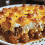 Shepherd’s Pie Tater Tot Casserole combines the savory flavors of traditional shepherd’s pie with the crispy texture of tater tots, creating a comforting and family-friendly dish.
