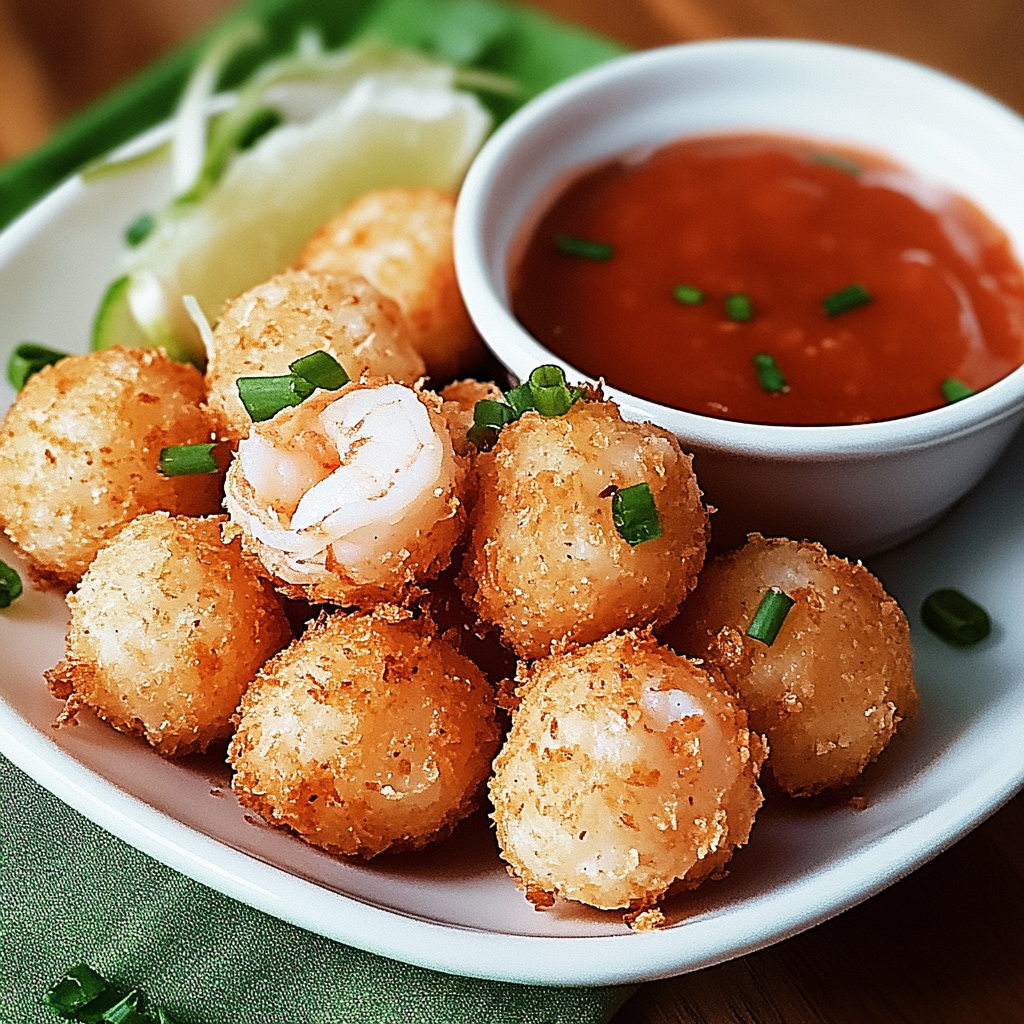 Crispy on the outside and juicy on the inside, these shrimp balls are a delicious appetizer or snack, perfect for dipping in your favorite sauce.
