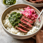Skirt steak rice bowls with chimichurri sauce are a flavorful and satisfying meal, featuring tender, marinated steak over a bed of rice, topped with vibrant homemade chimichurri. This dish combines smoky grilled steak, fresh herbs, and bold seasonings, making it a perfect weeknight dinner or meal-prep option.