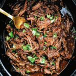 • Cover and cook on low for 8–10 hours or on high for 4–6 hours, until the beef is tender and easily shreds with a fork.