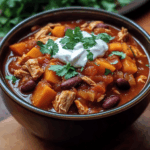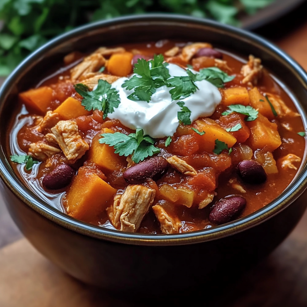 A hearty and nutritious slow cooker chili made with tender chicken, sweet potatoes, beans, and warm spices—perfect for a comforting and easy weeknight meal.