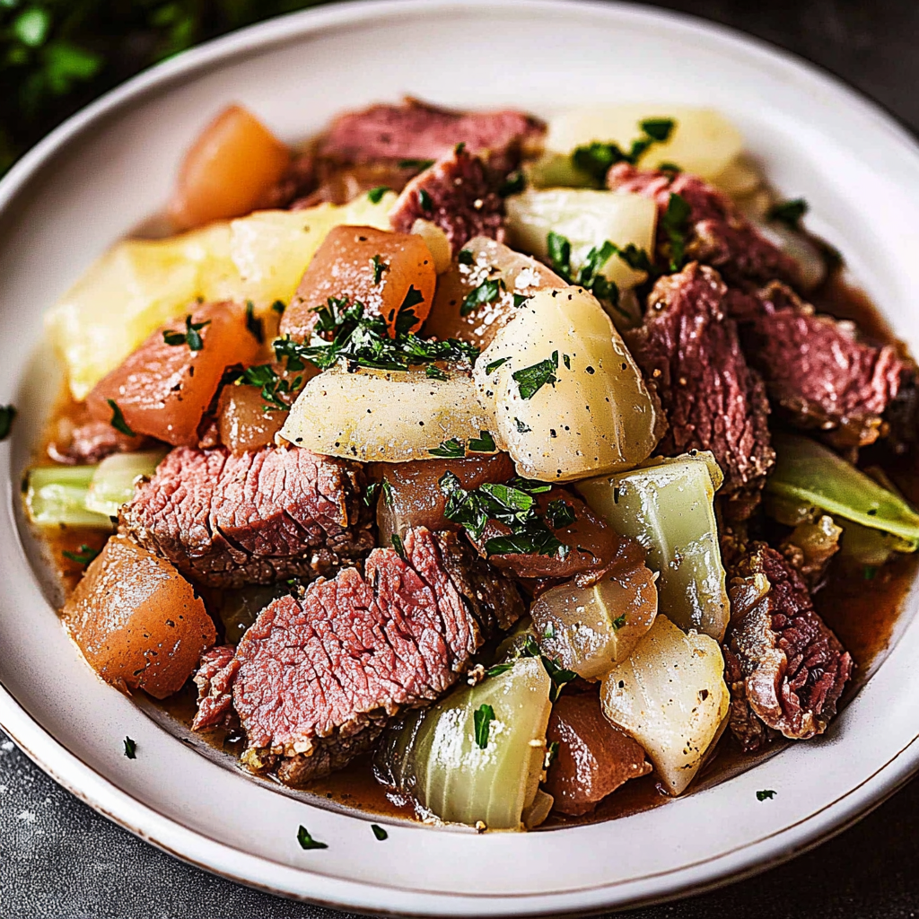 A hearty and flavorful traditional dish featuring tender corned beef, cabbage, carrots, and potatoes slow-cooked to perfection.