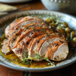 6. Make the Gravy: Pour the cooking juices through a strainer into a bowl, discarding solids. In a saucepan, melt 4 tbsp butter over medium heat, then whisk in the flour. Cook for 1 minute, then slowly whisk in the turkey drippings and chicken broth. Stir until thickened, about 3–5 minutes. Season with salt and pepper to taste.