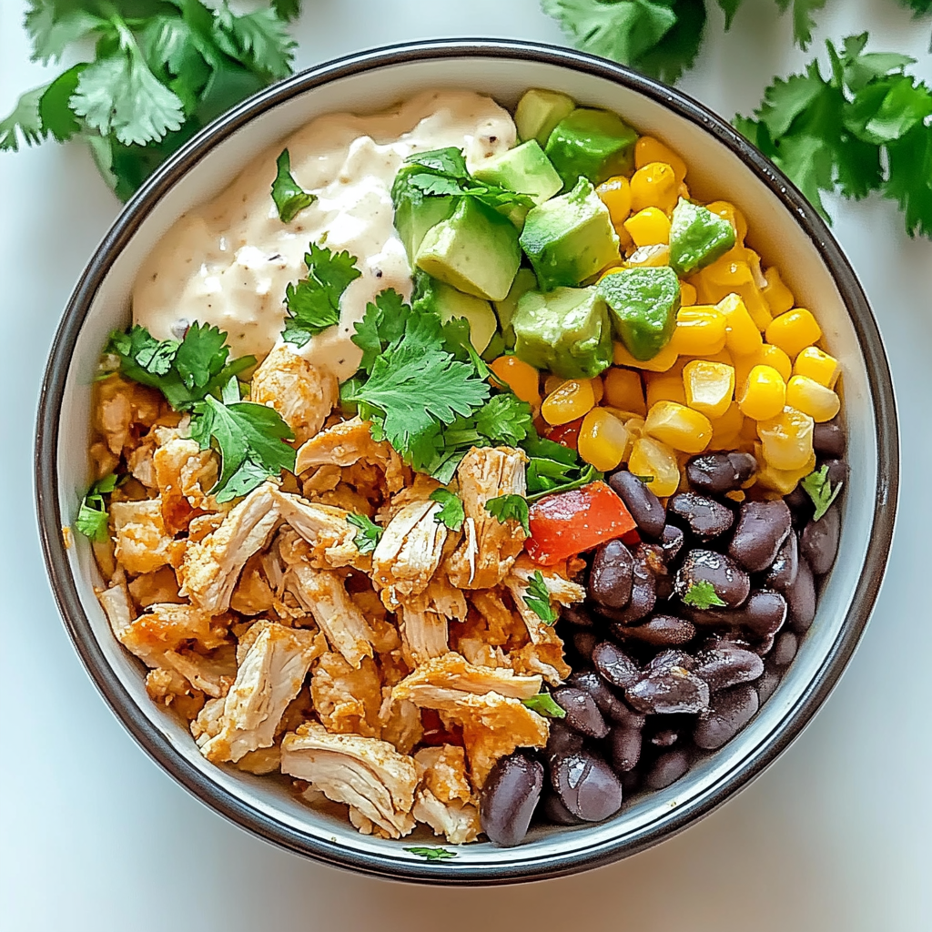 A flavorful and wholesome Southwest-style bowl featuring seasoned grilled chicken served over a bed of rice and black beans, topped with salsa, corn, avocado, cheese, and a creamy cilantro-lime dressing.