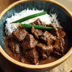 Spicy Beef Rendang is a slow-cooked Indonesian dish where beef is simmered in coconut milk and a fragrant blend of spices until it becomes tender, dark, and rich. The dish is deeply flavorful with a perfect balance of spice, savory depth, and a hint of sweetness.