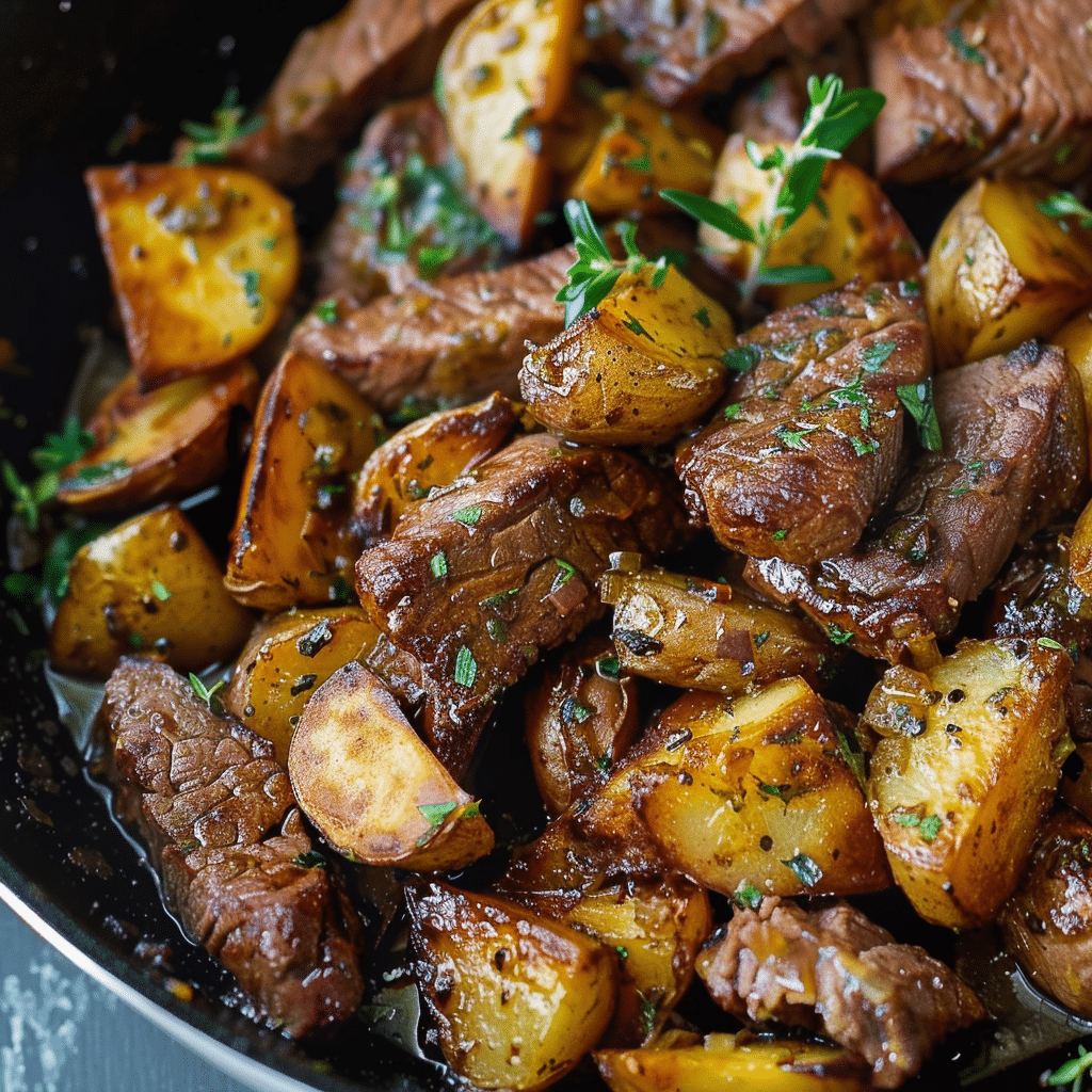 This dish features tender, juicy steak bites and crispy potatoes, all tossed in a rich garlic butter sauce. It’s a hearty and flavorful meal that’s perfect for any occasion.