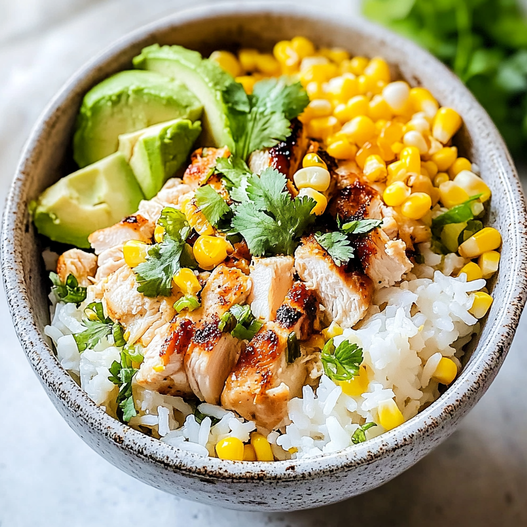 - Assemble the Bowls: Start with a base of rice, top with sliced chicken, then spoon the street corn mixture over everything.