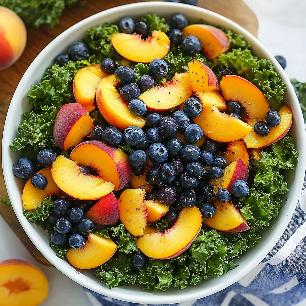 This refreshing salad features tender kale, juicy peaches, sweet blueberries, crunchy almonds, and creamy goat cheese, all tossed in a light honey-lemon dressing. It’s packed with nutrients and perfect as a side or a light meal!