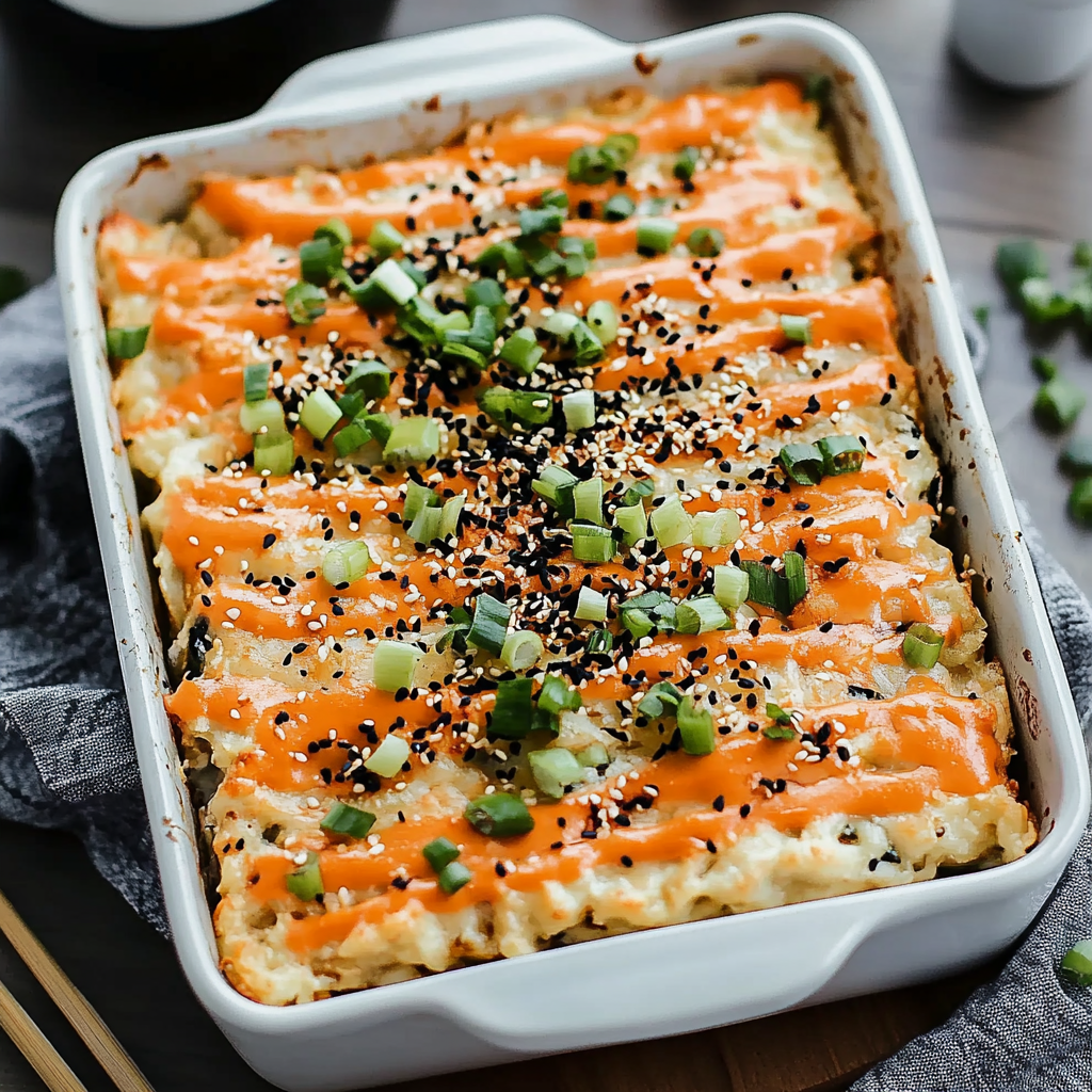 A deconstructed sushi dish baked in casserole form—layered rice topped with seasoned seafood, mayonnaise, and nori crunch, perfect for scooping onto rice crackers or served over greens.