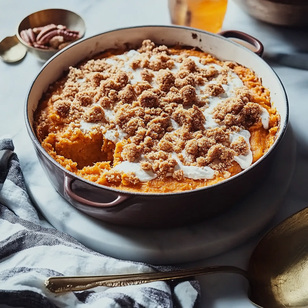 Sweet Potato Casserole with Pecan Crumble is a comforting and sweet holiday side dish featuring creamy mashed sweet potatoes topped with a crunchy, buttery pecan streusel.